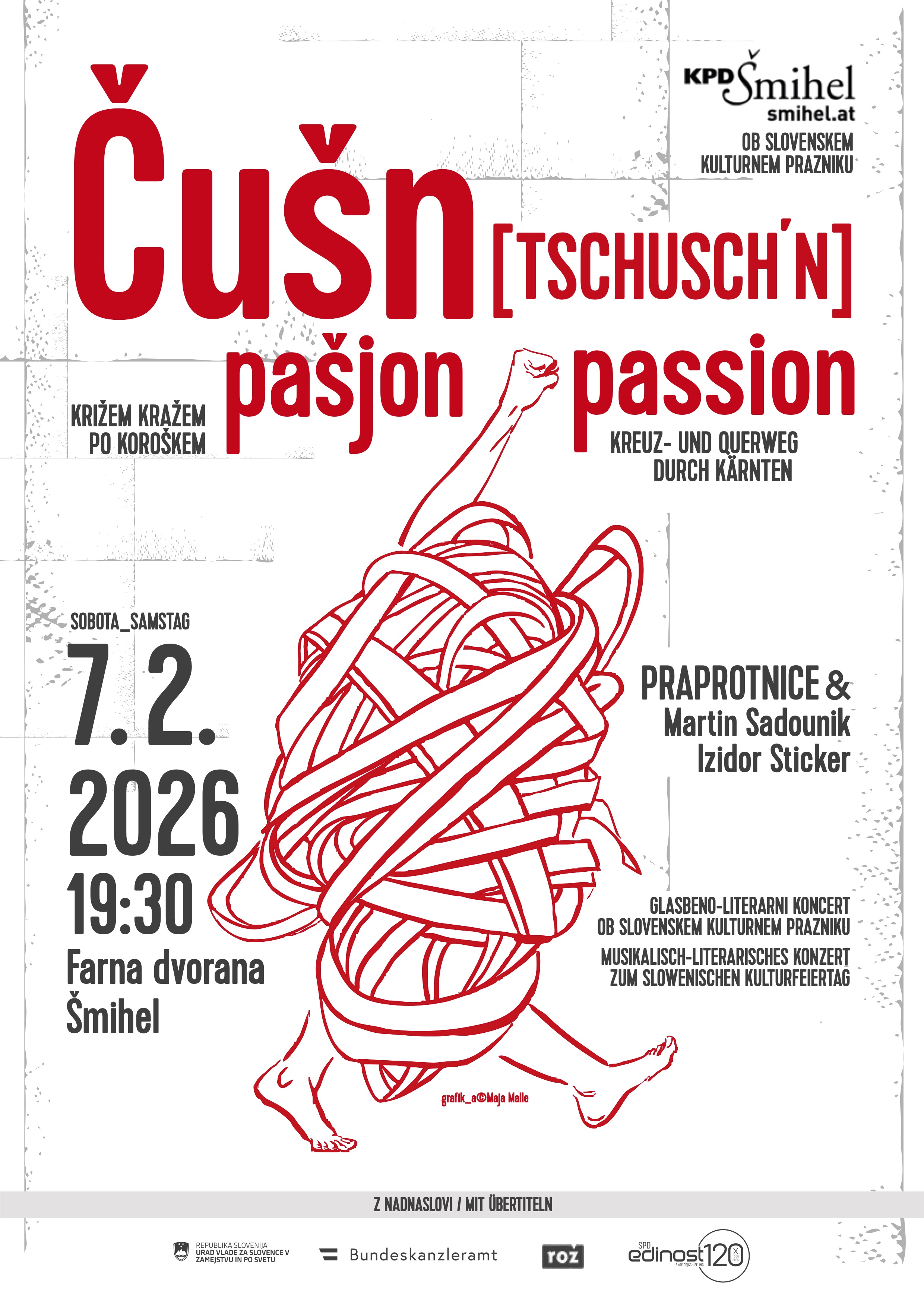 KPD Šmihel vabi ob slovenskem kulturnem prazniku v soboto, 7. februarja, ob 19.30 v farni dom na glasbeno-literarni koncert »Čušn pašjon«. Ansambel Praprotnice se poda na glasbeno potovanje skozi zadnjih 100 let. Literarni del večera bosta oblikovala Martin Sadounik in Izidor Sticker. Koncert bo v petek, 6. februarja, ob 19.30 tudi v farovžu v Šentjakobu.