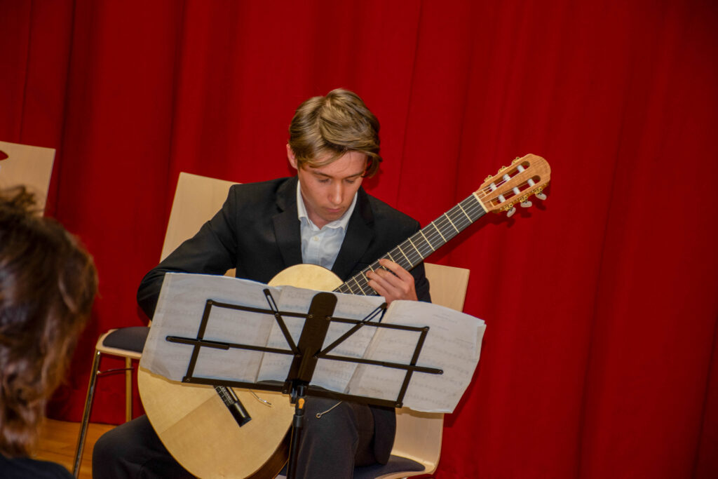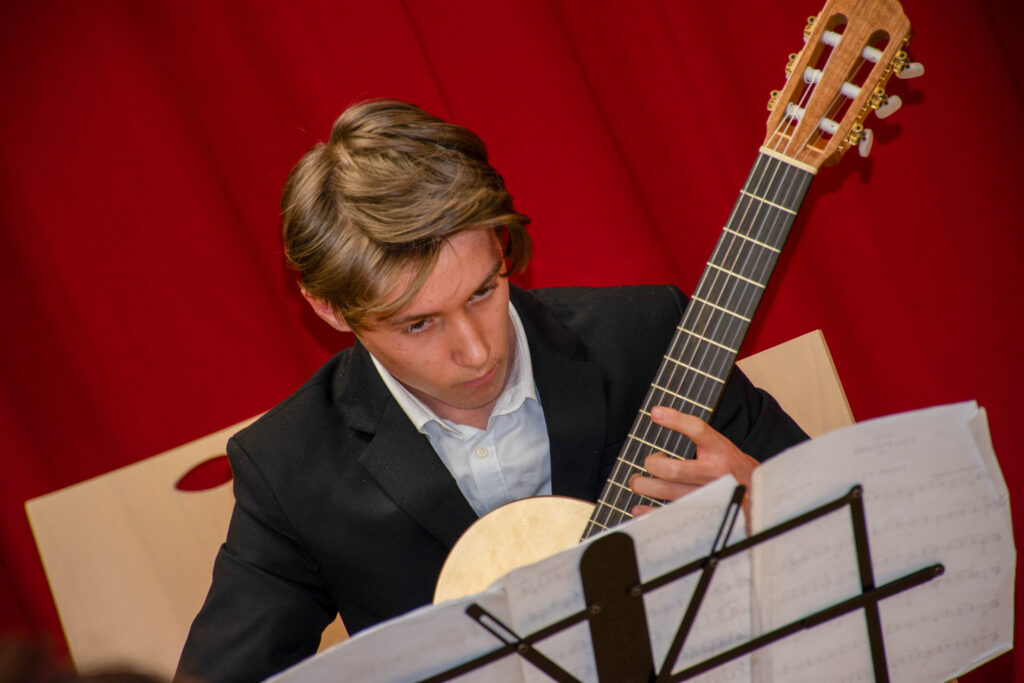 Kitaro igram osem let, ves ta čas je moj učitelj Marko Feri. Ta je zelo pikolovski in vedno izvleče iz mene vse, kar zmorem. Čar mojega instrumenta je predvsem ta, da ga lahko povsod vzamem s sabo, poleg tega mi ugaja zvok kitare. V Celovcu sem nastopil s Preludijem št. 1 brazilskega skladatelja Heitor Villa-Lobosa. Pred kratkim sem začel delati na skladbah, ki sta jih napisala španska skladatelja Francisco Tárrega in Joaquín Rodrigo. Med tednom vadim uro na dan, za vikend štiri ure ali več, pouk kitare in nauk o harmoniji pa imam dvakrat na teden. Želim si študirati kitaro na konservatoriju, poslušam pa vse od klasične in baročne glasbe preko brazilske glasbe do rocka in trapa.