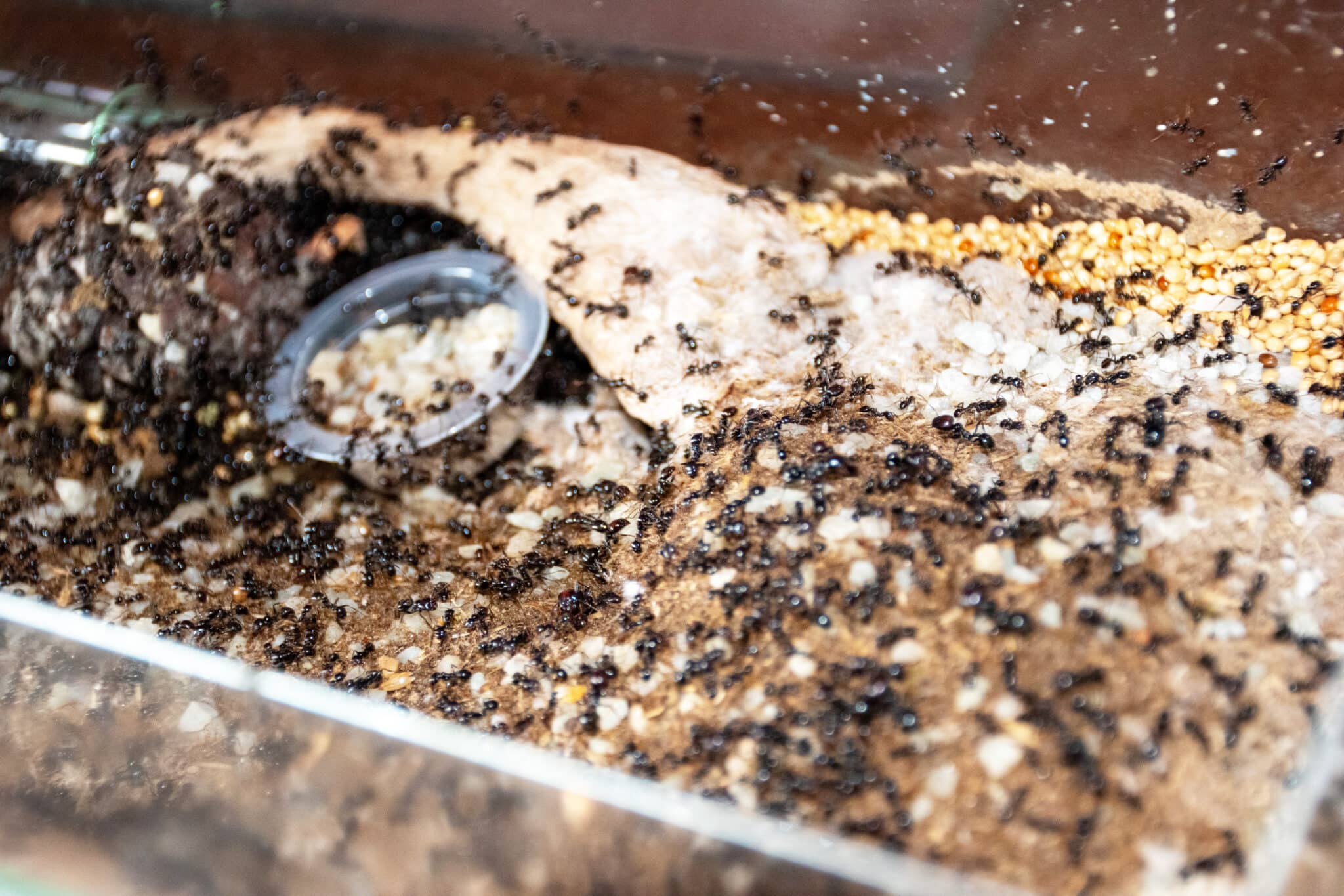 Pred mravljami so imeli pri Kupprovih že tri mačke, dve želvi, ribe, puščavskega skakača in morska prašička, ki sta poginila od starosti. »Sprva je bilo mravelj malo, šele zdaj lahko rečem, da kolonija letno raste,« pravi Benjamin Kupper, ponosni lastnik nekoliko nenavadnih hišnih ljubljenčkov. Ti niso posebej fotogenični, ne delajo trikov in se ne crkljajo, ampak saj se tudi želve in ribe ne, pa jih ima kljub temu marsikdo doma. »Moje mravlje so posebne po tem, da jedo rastlinska semena, s pomočjo sline iz njih ustvarijo neke vrste kruh, s katerim se hranijo pozimi.« Večina mravelj se namreč v ujetništvu hrani z drugimi žuželkami, ki so vir proteinov. Poleg semen Benjamin svojim mravljam daje tudi prekuhane deževnike in ubite muhe.